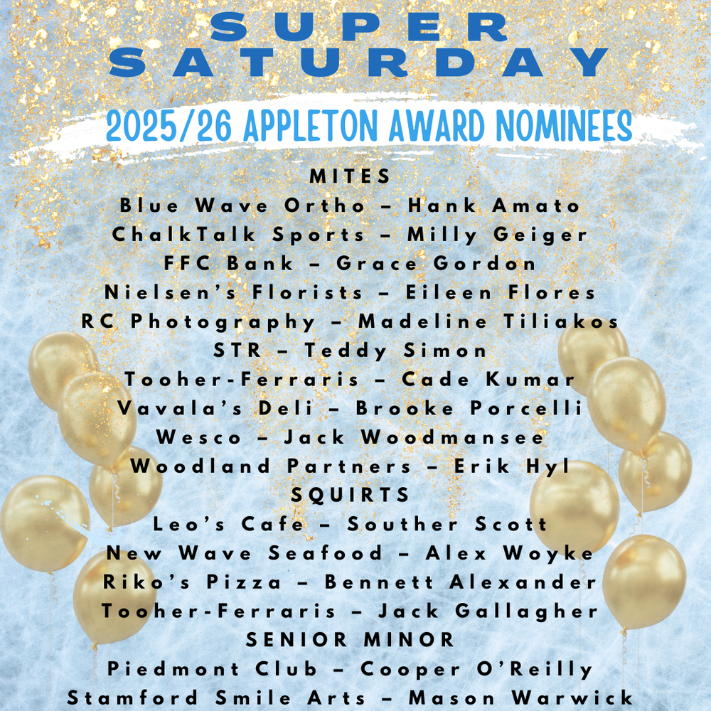Each year we recognize a group of players who represent what DYHA is all about through the Appleton Award, named after DYHA’s first President, Fred Appleton. This award is presented annually to House league players in the Mite, Squirt, and Senior Minor divisions who demonstrate leadership both on and off the ice. These players show up ready to work, support their teammates, and bring a great attitude to practices and games.